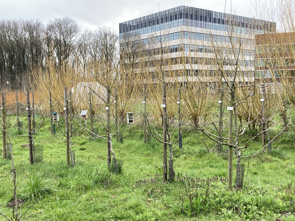 Slowly but surely, green life on campus is starting to get going again. Cornelian cherry has finished flowering, as have many catkins of willow, alder and hazel. The strip of stinsen bulbs planted last year along the oaks on the Droevendaalsesteeg has been forming a colorful whole for a few weeks now. Blossom of the Juneberry, the sweet cherry, medlar and other fruit trees is starting to sprout. In particular of the 100 apple varieties from the 'timeline of apple production' planted in 2016 by the Center for Genetic Resources (CGN-)Wageningen: wild apples in the landscape garden, a 'modern' orchard on The Field near Vitae and in between two groups with standard trees at the Forum and the amphitheater. You can recognize them by the white signs on the trunk with the CGN number and sometimes a variety name. They receive the same treatment as all other trees on campus, so no fertilizers or pest and disease control, which means that some more vulnerable varieties will eventually disappear.