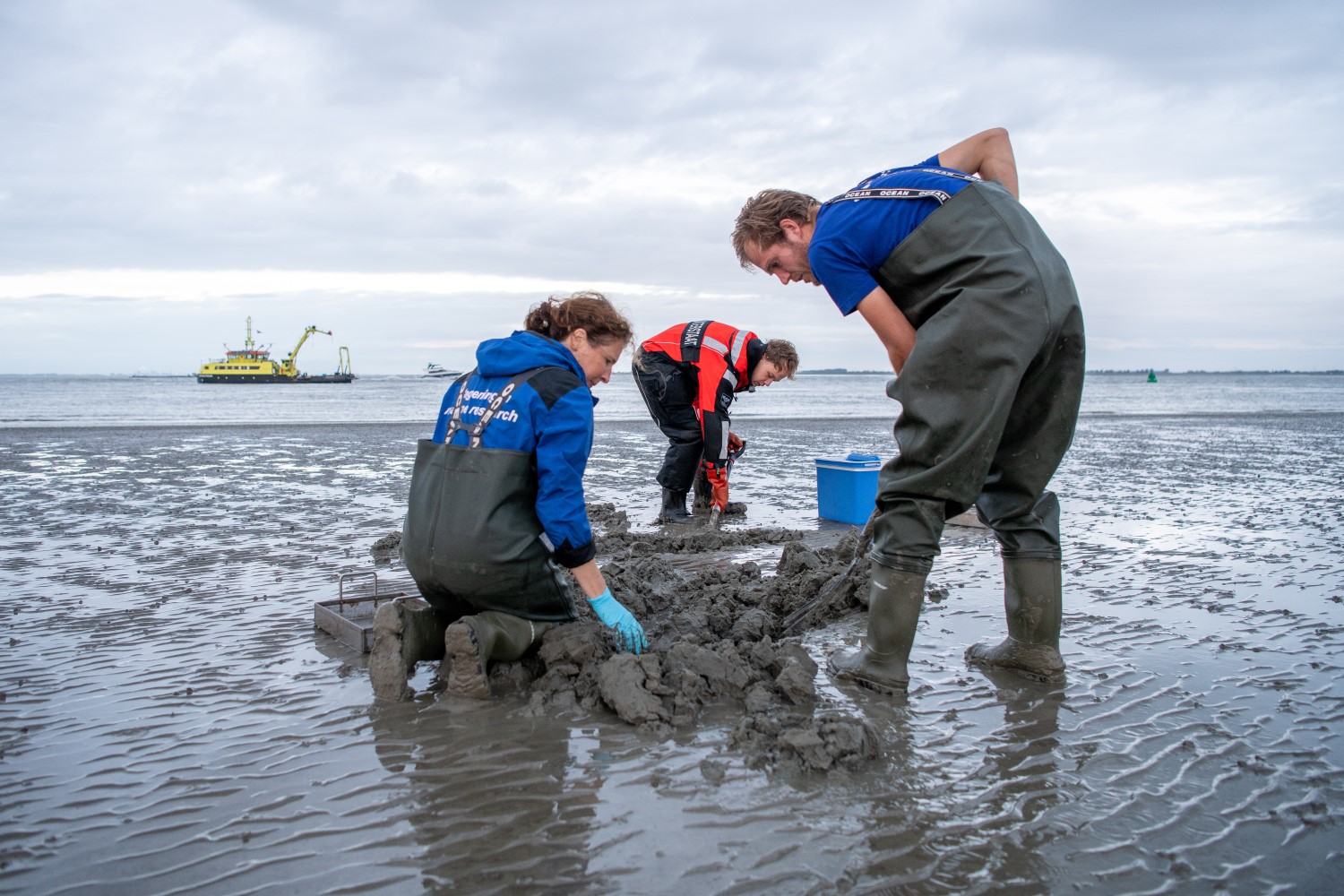 Onderzoekers van Wageningen Marine Research verzamelen wadpieren in de Westerschelde voor PFAS-analyse. september 2023 | Foto: Studio Retouched