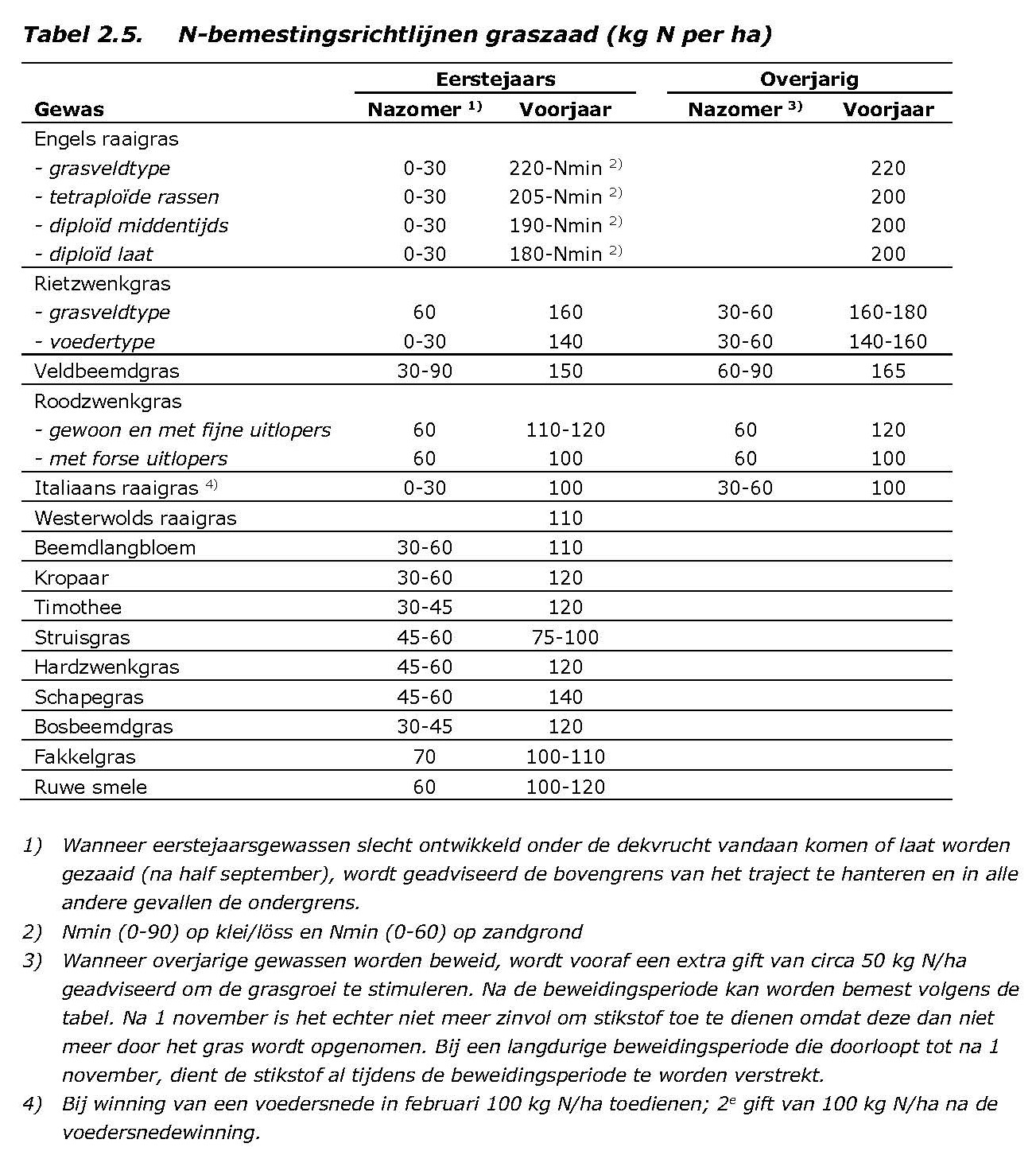 In Tabel 2.5 staan de N-bemestingsrichtlijnen voor de teelt van graszaadgewassen weergegeven. Benadrukt moet worden dat alleen de richtlijnen voor Engels raaigras redelijk goed zijn onderbouwd met onderzoek. Bij de overige soorten betreft het informele richtlijnen die op weinig onder­zoek en soms alleen op praktijkervaringen zijn gebaseerd. Aan roodzwenkgras en veldbeemdgras is in het verleden ook onderzoek gedaan, maar het sortiment is veranderd naar fijnere rassen met een hogere N-behoefte.