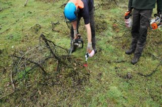 Mechanische/chemische verwijdering van zaadbronnen door afzagen van de Amerikaanse Vogelkers en daarna de stobben insmeren met glyfosaat.